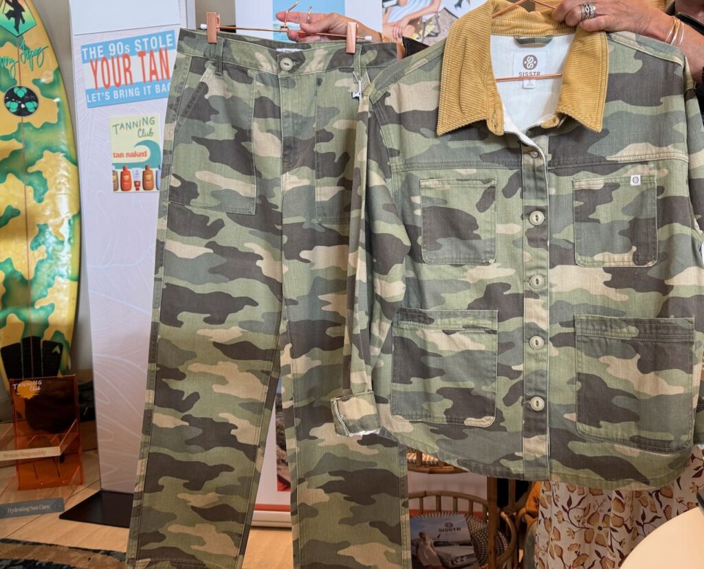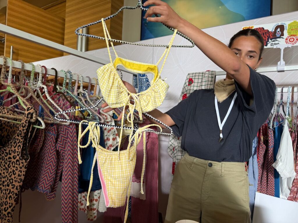 The women’s surf brand was showing Fall ’26 at the show, and key trends included polka dots, camo, matching sets, reversible swim, and Peter Pan collars.